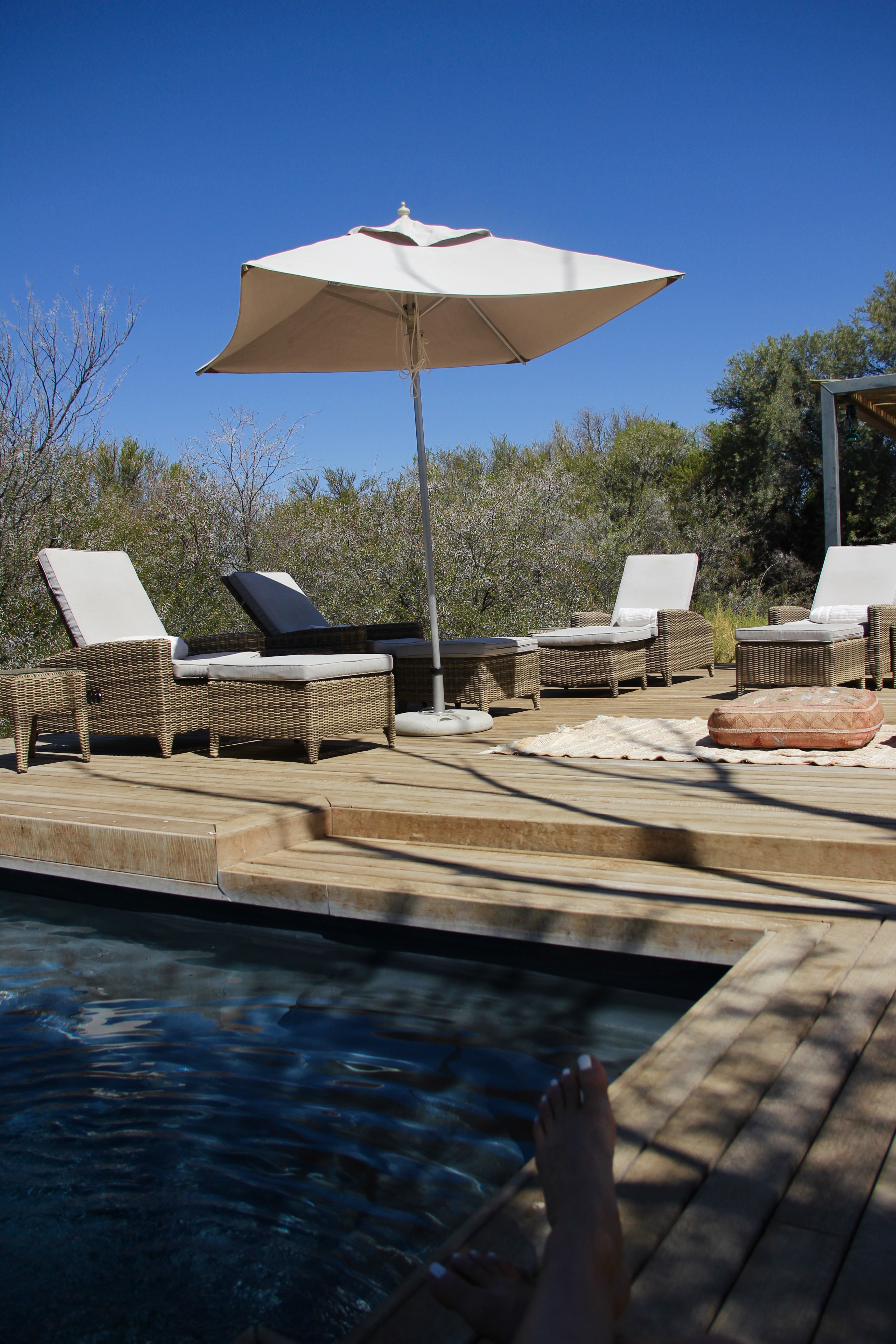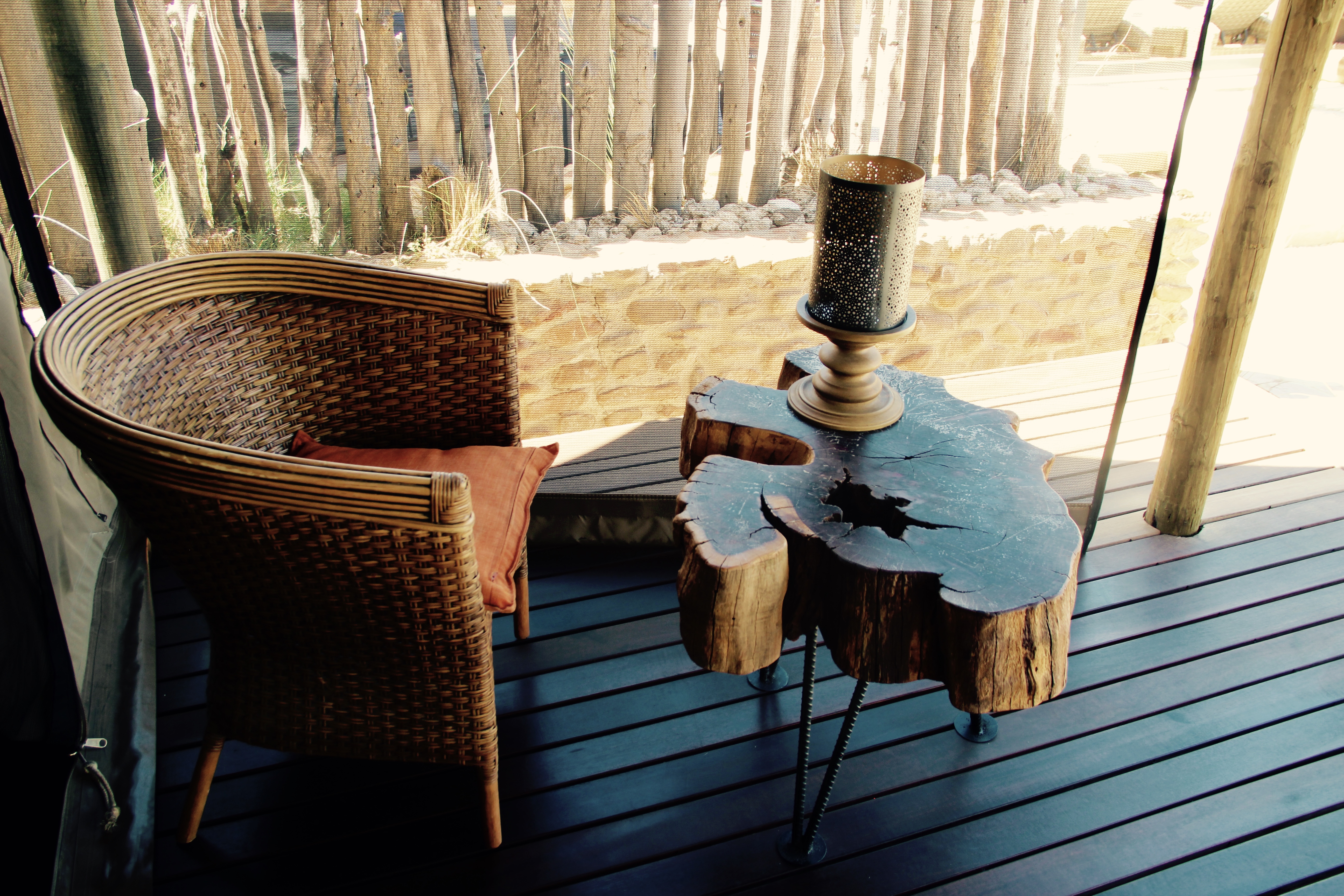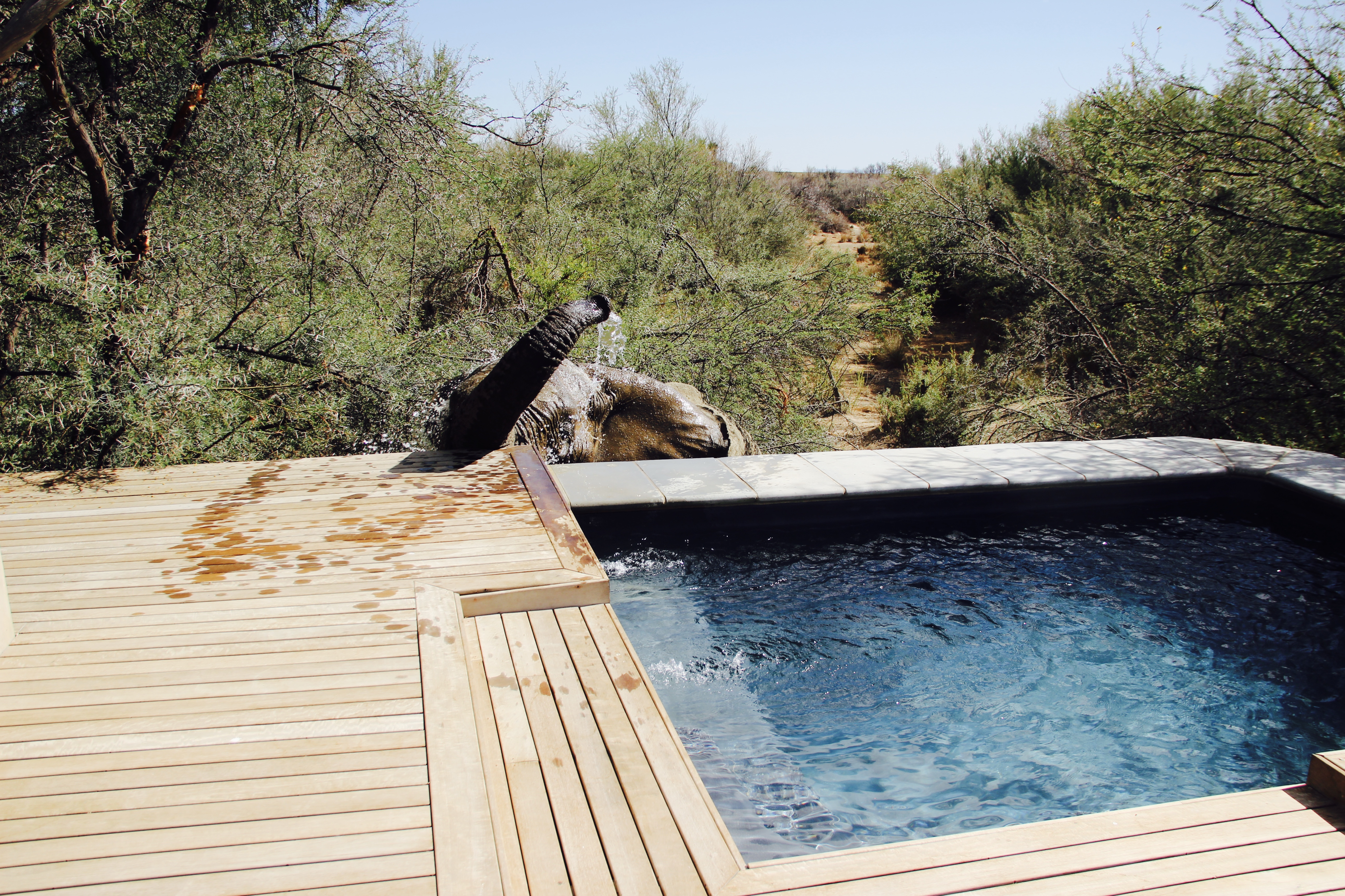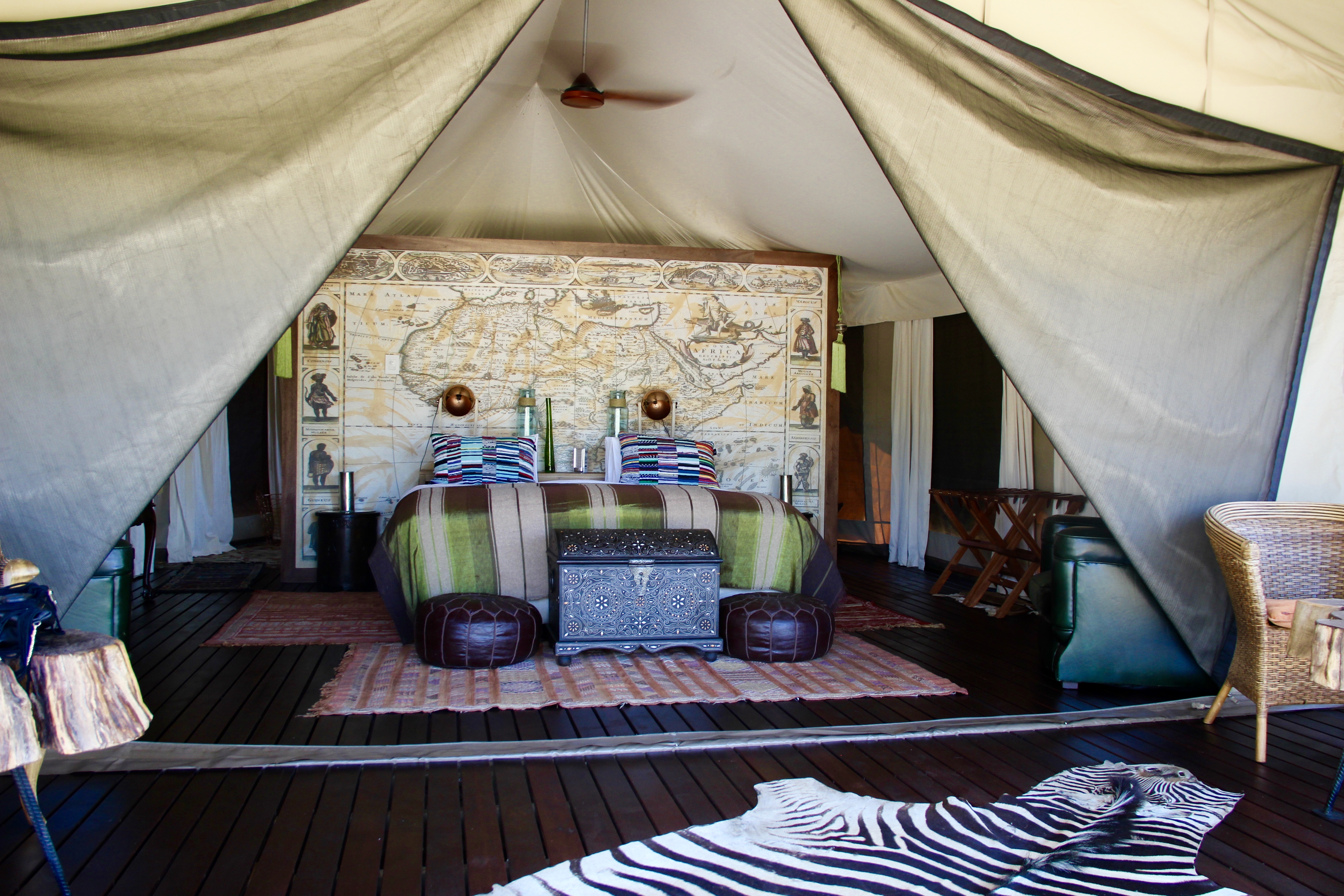 Da ich schon zwei Safaris um Kapstadt gemacht habe, wusste ich bereits, bei welcher man relativ sicher die ‚Big Five‘ sehen wird. Außerdem hatte ich den Vergleich verschiedener Reservate und konnte abschätzen, was meiner Familie, die mich dieses Mal begleitet hat, besser gefallen würde. Menschen, die bereits den Kruger Nationalpark besucht haben, wird diese Aktion vermutlich eher langweilen, da die Game Reserves viel kleiner sind und die Ranger meist wissen, wo die Tiere sich aufhalten. Dennoch ist es eine wunderbare Erfahrung, solch wilde Arten hautnah beobachten zu können. Die Reservate sind umzäunt, um Wilderer abzuhalten, sie sind aber trotzdem so groß, dass man die Tiere suchen muss. Ich bin überhaupt kein Fan von Zoo’s, muss ich sagen. Es ist mir zuwider, die Tiere in engen Gehegen zu beobachten, wie sie vor sich hin vegetieren. Es ist fast unmöglich, den Tieren in Deutschland ein ‚artgerechtes‘ Umfeld zu bieten, darum kann ich nur jedem der fremde Tiere liebt, empfehlen, sich einmal auf den Weg zu machen. Wohin auch immer, aber eine Begegnung mit einem Tier in freier Wildbahn, ein Kontakt der nicht erzwungen oder trainiert ist, ist für mich etwas Magisches. Wer also keine Scheu hat, 3 Stunden lang in Richtung Wüste zu fahren, der sollte unbedingt das Inverdoorn Game Reserve besuchen. Wie Ihr wisst, bin ich ein kleiner Designfreak und möchte natürlich auch bei einer Safari ein angemessenes Ambiente erleben. Da die Himmel in der Wüste gerade am Abend besonders schön zu betrachten sind, habe ich mich dieses Mal für die Unterbringung in einem luxuriösen Zelt entschieden. Das Kuganha Zelt Camp ist wahrlich ein Juwel. Es besteht aus nur drei Zelten, die nebeneinander aufgebaut sind und beherbergt jeweils 2 Personen. Es geht hier jedoch eher um einen romantischen Filmausschnitt wie in ‚Jenseits von Afrika‘ als um den Campingplatz in Pelzerhaken. Ein absolut atemberaubend schönes ‚Glamping‘ Erlebnis. Die Zelte sind wunderschön eingerichtet, es fehlt einem an nichts, es gibt einen Kühlschrank mit kostenlosen Drinks, ein eigenes Bad, ein riesiges, kuscheliges Bett, eine eigene Terrasse und einen Pool, den man sich mit den zwei anderen Zeltnachbarn teilt. Da wir als Familie alle drei Zelte bezogen haben, waren wir vollkommen unter uns, was ich als sehr luxuriös empfand.