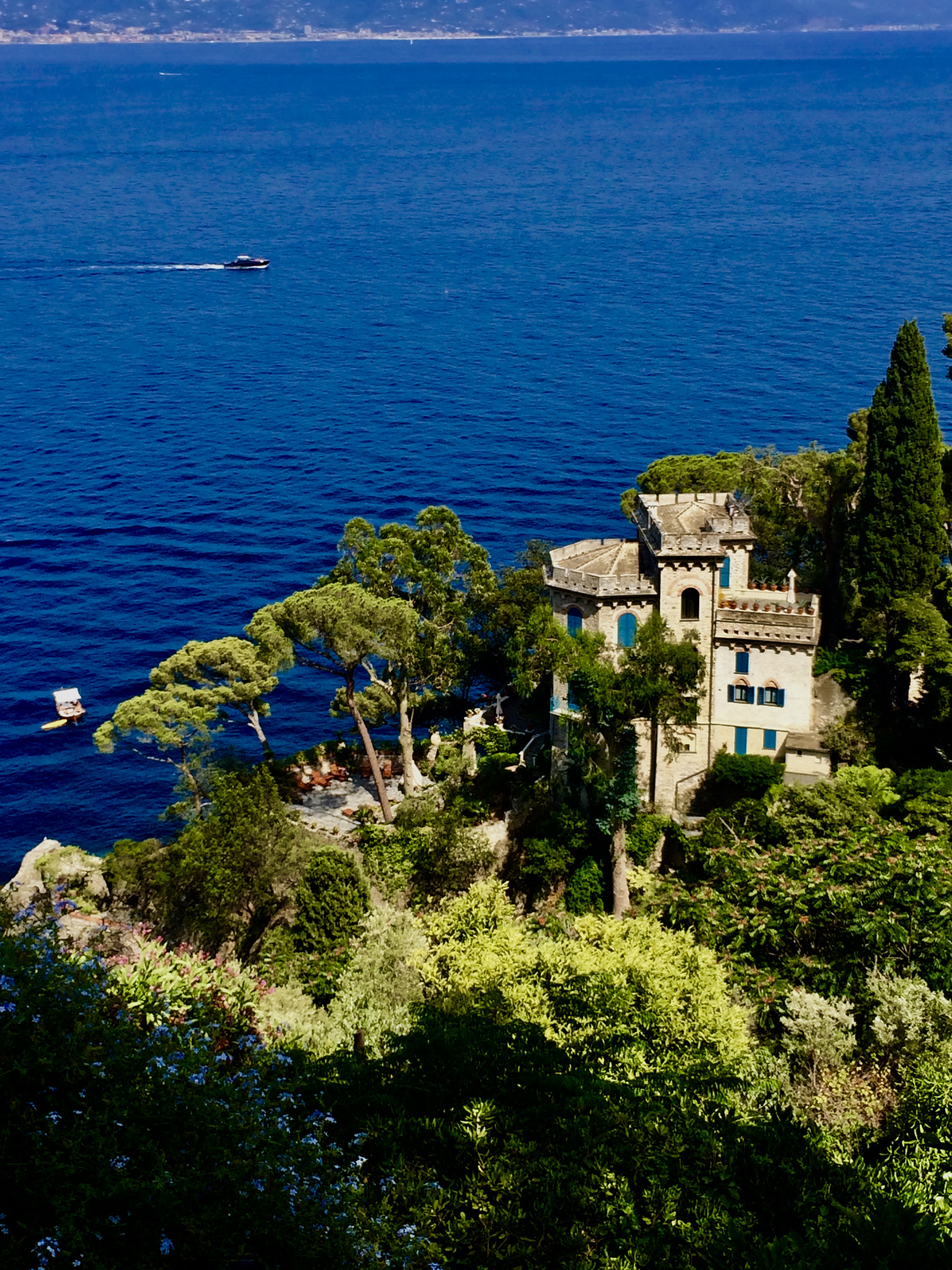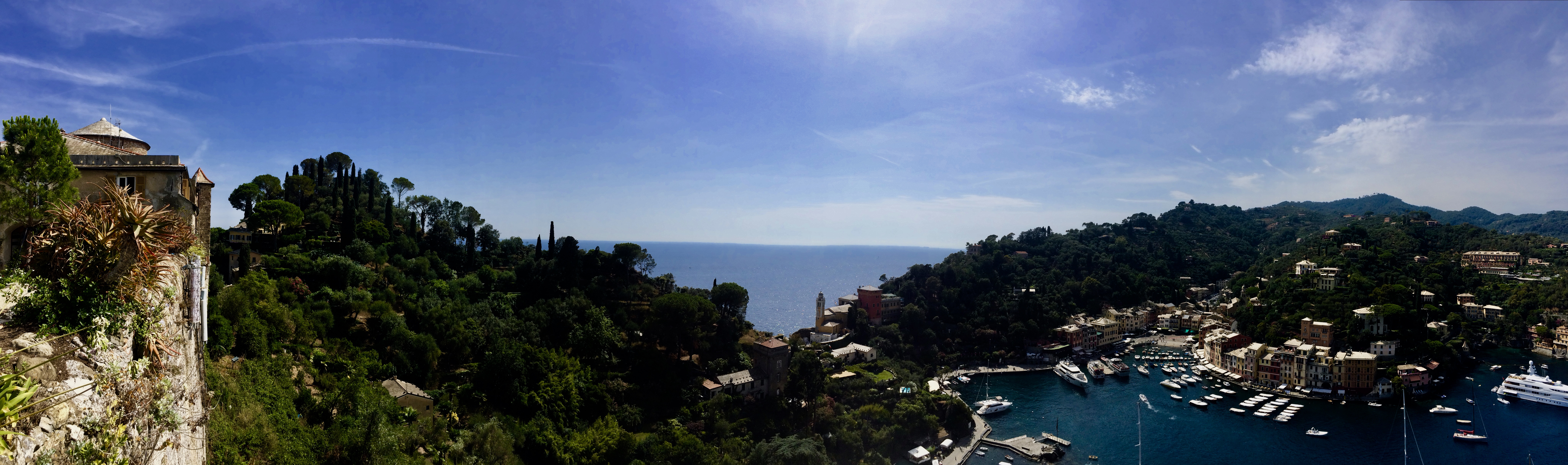 Portofino ist von Santa Margherita aus zu Fuß, oder mit der Fähre zu erreichen, die Fahrt mit dem Boot dauert nur kurze 15 Minuten, zu Fuß geht man in etwa 1 Stunde und 15 Minuten. Portofino hatte ich zumindest schonmal gehört, aber auch hier hatte ich keine Vorstellung was mich erwarten würde. Es ist einfach unfassbar schön. Es ist nicht schwer sich vorzustellen, dass es noch immer ein Ort der High Society ist. Es hat etwas so mondänes und glamouröses, gleichzeitig aber auch etwas warmes, klassisches, etwas verbindliches, ursprüngliches. Wir wanderten aus der schönen Bucht hoch auf die Burg, das sogenannte Castello Brown. Der Eintritt liegt bei 5€ die man in jedem Fall investieren sollte, um einige schöne Ausblicke genießen zu können. Von der großen Terrasse blickt man runter auf die Villa von Dolce & Gabbana in der schon die ganz großen Hollywood Stars untergekommen sind und in der regelmäßig Fashion Shows für die oberen Zehntausend stattfinden. Wenn man in die direkt vor der Villa liegende Bucht schaut, sieht man viele kleine Boote mit jungen Leuten die riesen Spaß haben ins Wasser zu springen, oder sich zu sonnen. Das faszinierende an diesem Anblick, ist die Tatsache der Harmonie die dieses Bild widerspiegelt und die man in dieser Form wohl nur hier in Italien zu sehen bekommt. Die Boote sehen alle fast gleich aus, sie sind weiß mit Teakhölzernen Stegen obenauf und sehen irgendwie wahnsinnig elegant aus. Als ob es Set Designer, oder Stylist vorab geplant hätte, wie das ganze Ensemble auszusehen hätte. Ein bisschen wie die alten Filme in denen große Filmdiven mitspielten. Es war absolut vollkommen.