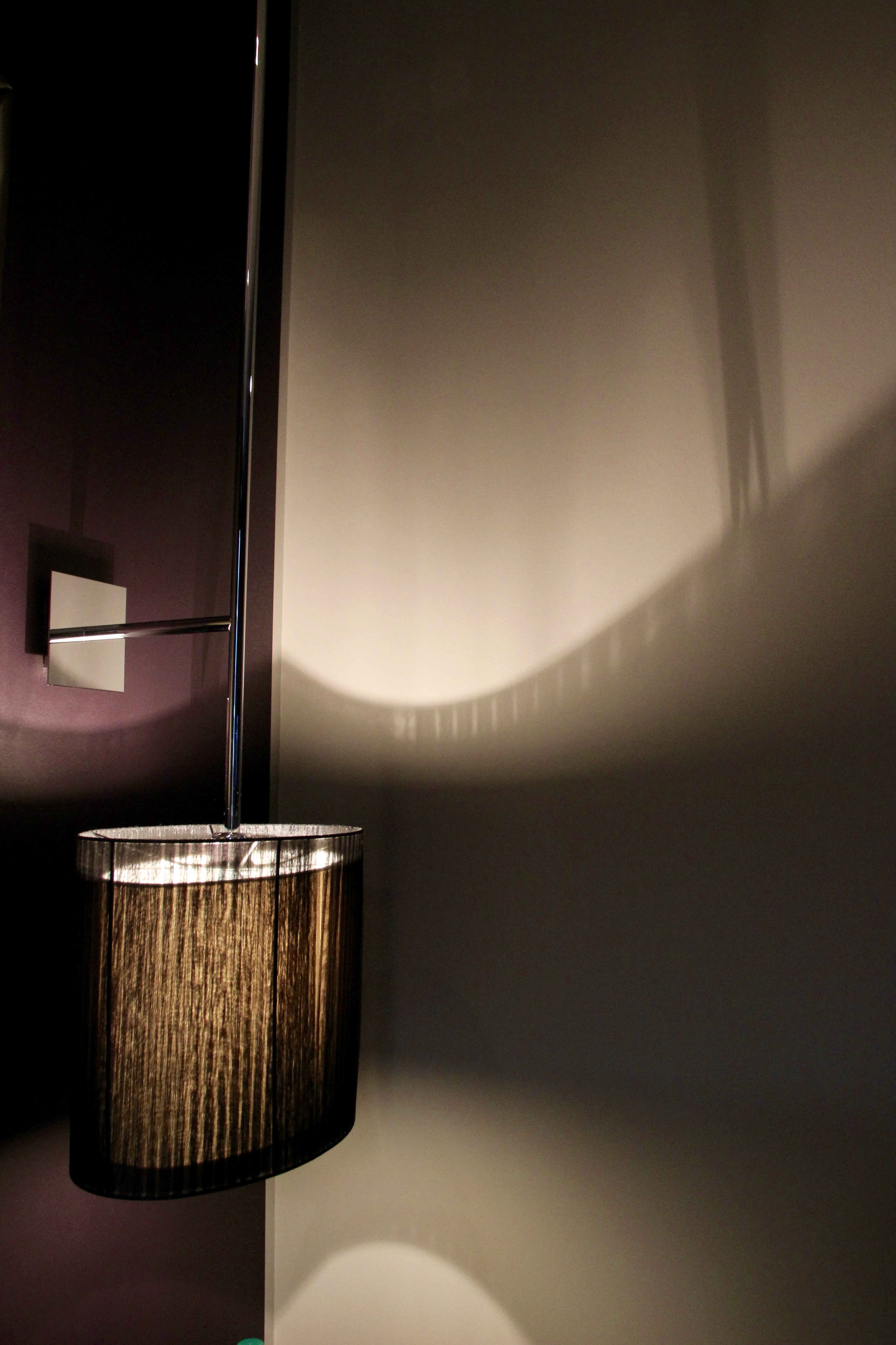 Nun denn. Wir begeben uns also in unser- wie angekündigt- ruhiges Zimmer auf der 4 Etage. Und ja, es ist wirklich wunderbar ruhig und einfach eine Augenweide. Ein sophisticated, sexy Zimmer. Es ist irgendwie verrucht, aber sehr edel dabei, alles sehr dunkel mit viel schwarz und lila, glänzende Ablagen im Bad, definitiv ein Zimmer das sich beste Freundinnen, oder recht eingespielte Paare teilen könnten, denn die Toilette ist nur von einer verzierten Glasscheibe verhüllt. In der Dusche gibt es einen großen Spiegel und viel Platz, außerdem eine recht großzügige Sitzgelegenheit, lach. Jeder wie er meint, nech. Wäre die Toilette etwas isolierter oder versteckter, würde ich es als perfekt bezeichnen. Dann könnte man zur Not auch mit seinem Kumpel dort übernachten. So aber eher für Menschen, die sich gut kennen, oder keinerlei Berührungsängste mit recht offenen Badkonstruktionen haben. Ein wundervolles, hochwertiges Bett, tolle Bettwäsche, kuschelige Kissen, ein felliges Plaid, großartige Lichtinstallationen die man von fast überall aus bedienen kann. Diese hoch technischen Schalter konnte ich zwar nicht ganz korrekt nutzen, ich habe mich ehrlicherweise dieser Materie auch nicht besonders intensiv gewidmet. Von daher, es geht bestimmt, wenn man sich einmal damit vertraut gemacht hat. Die schweren Vorhänge sichern dass man den Tag zur Nacht machen kann und die ultracoole Bluetooth Box von Marshall sorgt für den Sound sobald man sich connected hat. Auch das Wifi funktioniert tadellos und zügig.