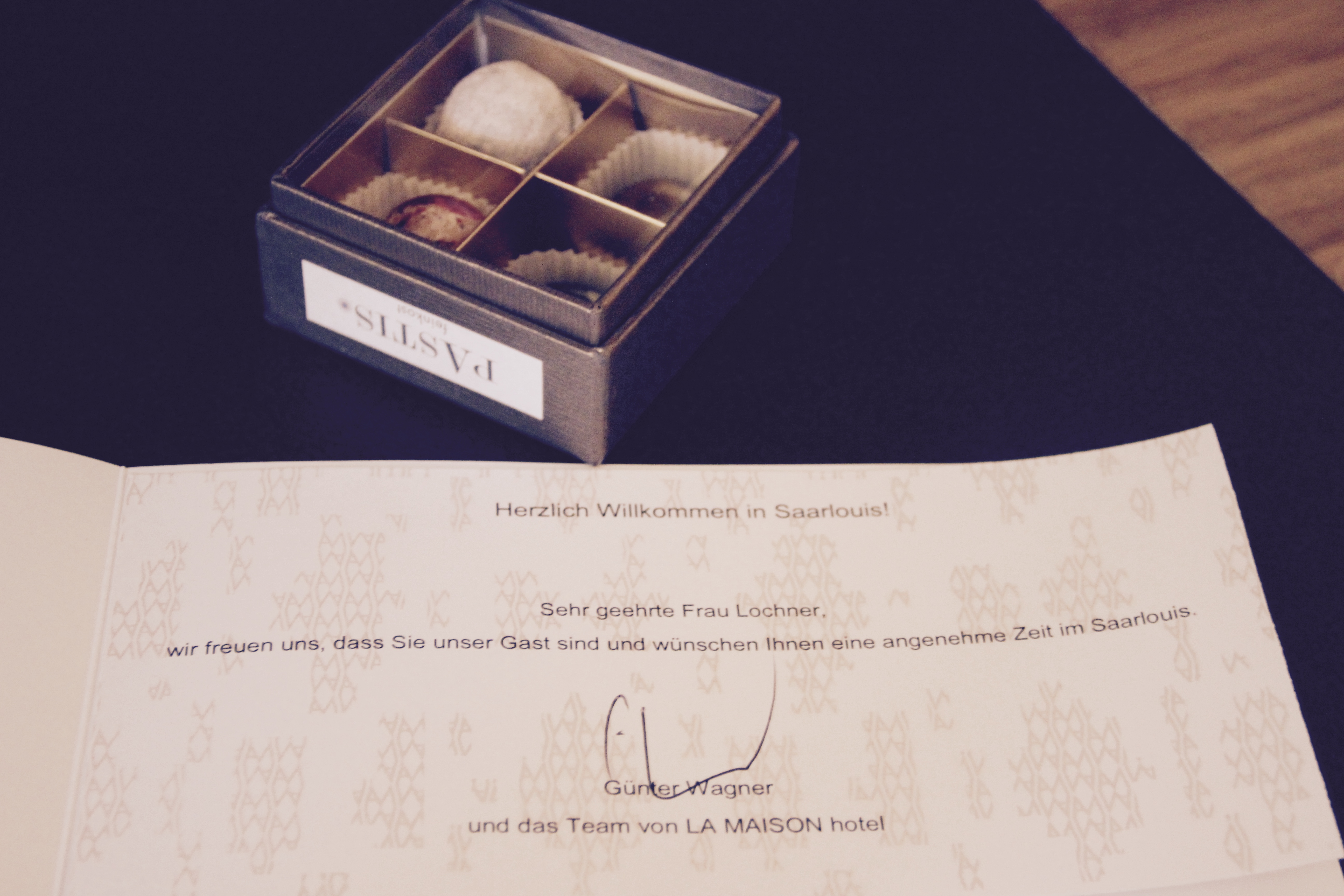 Im Zimmer angekommen erwartete mich eine wunderbar süße Überraschung. Der Hausherr begrüßte mich schriftlich mit einem kleinen Willkommensgeschenk in Form einer Karte und feinsten Pralinen. Ich träume noch immer von diesen kleinen Köstlichkeiten. Allein wegen diesen, würde ich wiederkommen 🙂