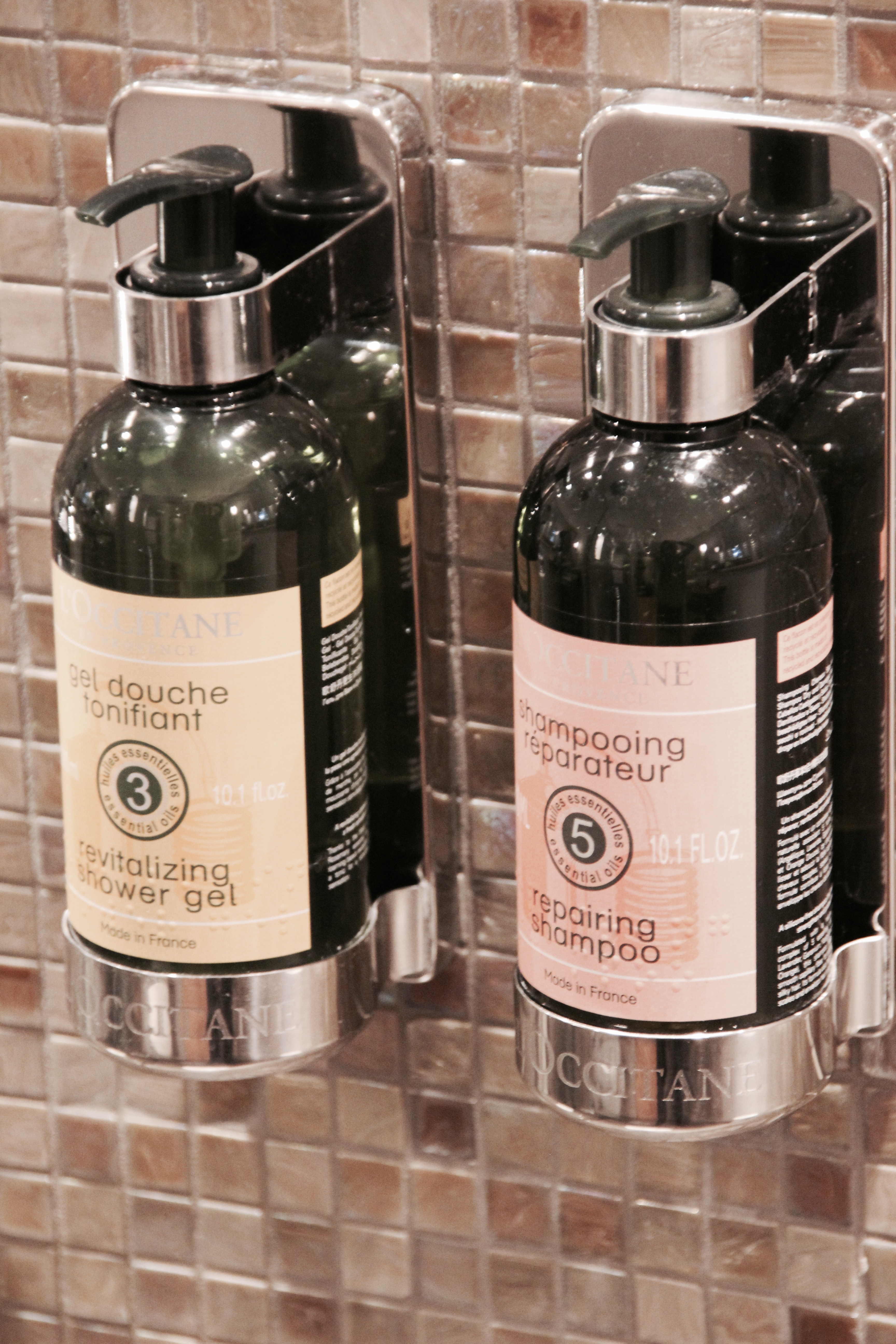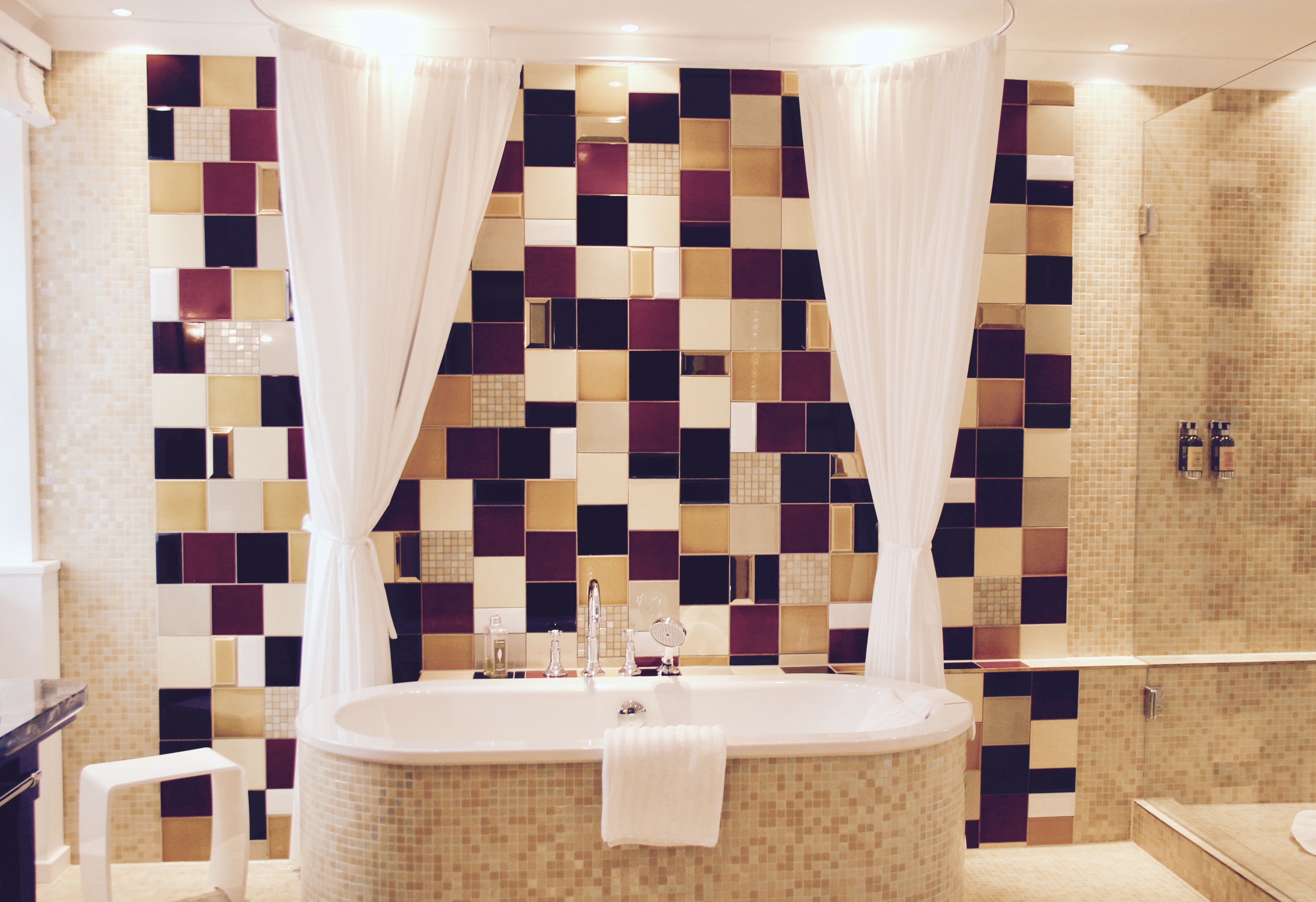 Die Ausstattung im Hotel La Maison- welch Überraschung, ist vollkommen. Das Bad ist groß und gläsern, hat ein integriertes Radio, einen ordentlichen Sichtschutz- wenn man mag- und die wunderbaren Seifen von L’occitane. Was will man mehr? Die Dusche aus schimmernden Mosaik Steinen, liebevoll und hell, ein großer Waschtisch und jede Menge Platz sich auszubreiten.